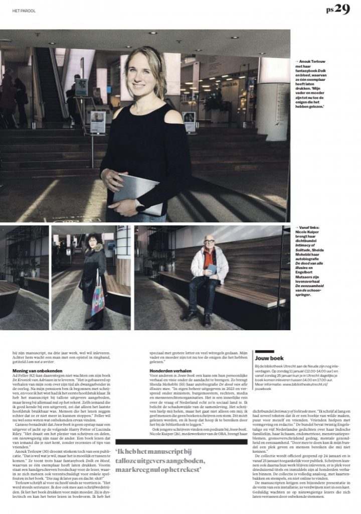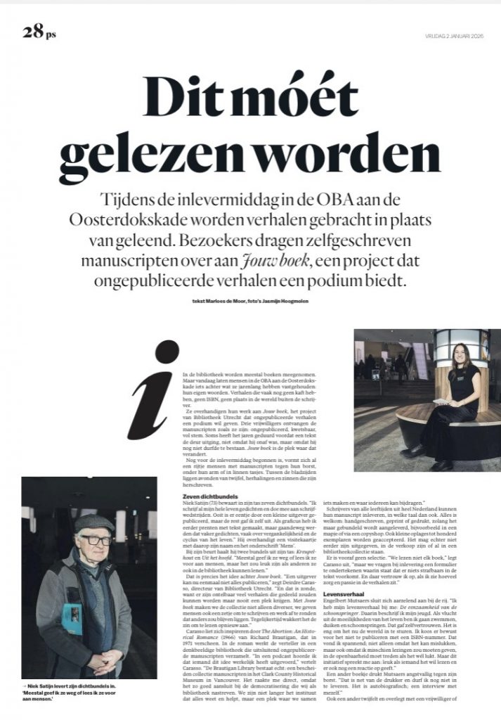 Tijdens de inlevermiddag in de OBA aan de Oosterdokskade worden verhalen gebracht in plaats van geleend. Bezoekers dragen zelfgeschreven manuscripten over aan Jouw boek, een project dat ongepubliceerde verhalen een podium biedt. https://www.parool.nl/ps/nooit-gepubliceerde-manuscripten-krijgen-plek-in-bibliotheek-mijn-vader-en-moeder-zijn-de-enigen-die-het-hebben-gelezen~b9f8de7f/?fbclid=IwY2xjawPTC3RleHRuA2FlbQIxMABicmlkETBhYVk4bUlETGFMSkhSZG5Cc3J0YwZhcHBfaWQQMjIyMDM5MTc4ODIwMDg5MgABHinaFxR9754D0huwBKqzqGX4rlUwjEkATBNdbiEPi4kcAGYlG2X4saDKwhbx_aem_Cs7bK8ef1I2YNWT4ib1c2A