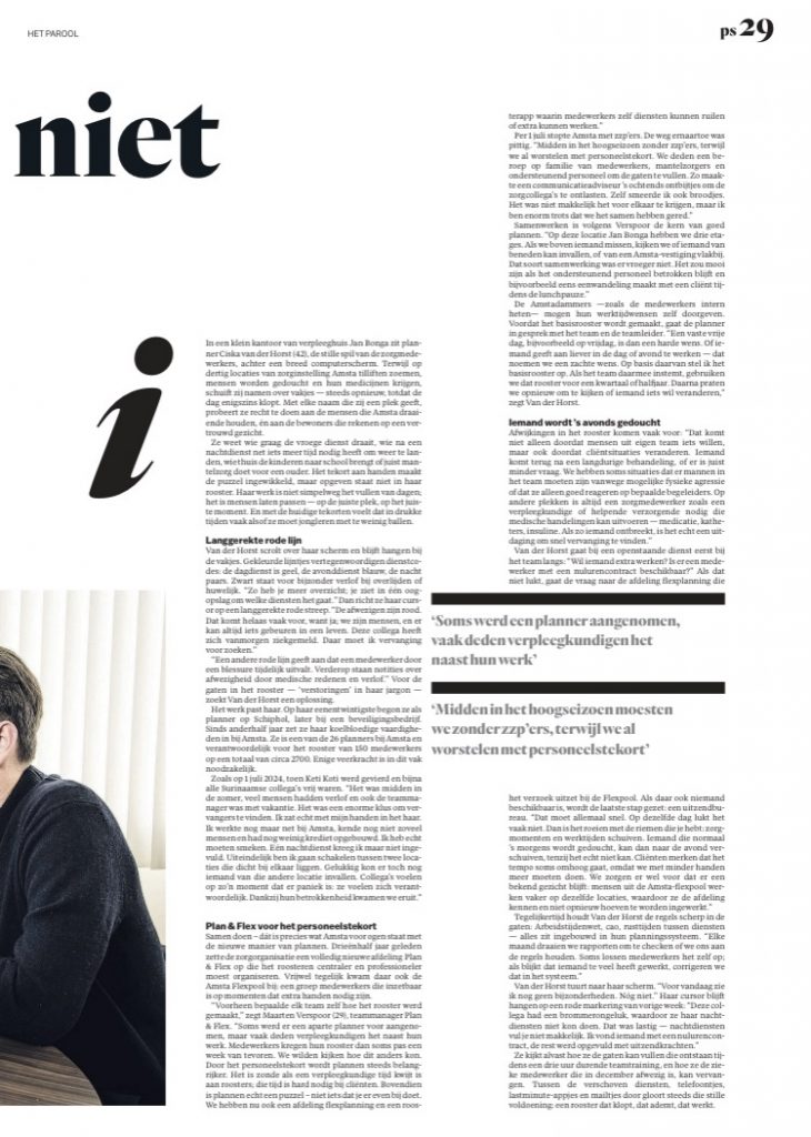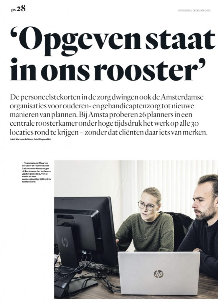 De personeelstekorten in de zorg dwingen ook de Amsterdamse organisaties voor ouderen- en gehandicaptenzorg tot nieuwe manieren van plannen. Bij Amsta proberen 26 planners in een centrale roosterkamer onder hoge tijdsdruk het werk op alle 30 locaties rond te krijgen – zonder dat cliënten daar iets van merken. https://www.parool.nl/ps/zij-vullen-bij-de-amsterdamse-zorginstelling-amsta-met-26-roostermakers-de-vele-gaten-op-het-voelt-vaak-alsof-ik-moet-jongleren-met-te-weinig-ballen~bc0bab30/