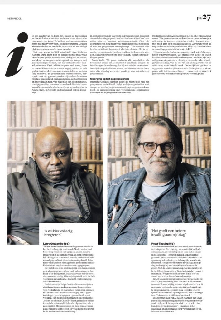 In Zuidoost opende Gouden Mannen dit jaar een nieuwe locatie voor mannen vanaf middelbare leeftijd die kampen met eenzaamheid, gezondheidsproblemen of een afstand tot de samenleving. Het programma, al op meerdere plekken in het land actief, blijkt een effectieve manier om deze vaak onzichtbare groep structuur en zelfvertrouwen te geven. https://www.parool.nl/ps/dit-amsterdamse-project-haalt-een-onzichtbare-groep-mannen-met-problemen-uit-isolement-ik-leer-me-niet-te-hoeven-schamen~b634dc87/?fbclid=IwY2xjawOuaCxleHRuA2FlbQIxMABicmlkETBhYVk4bUlETGFMSkhSZG5Cc3J0YwZhcHBfaWQQMjIyMDM5MTc4ODIwMDg5MgABHnY4b-idGJ3sEdiRiaPn3gZJuE5lpSHKOeMKRtbWLUpcGa2ymDxWpn9hLddJ_aem_gr7LvBE0oUh72SV3O_j-_A&referrer=https%3A%2F%2Fl.facebook.com%2F