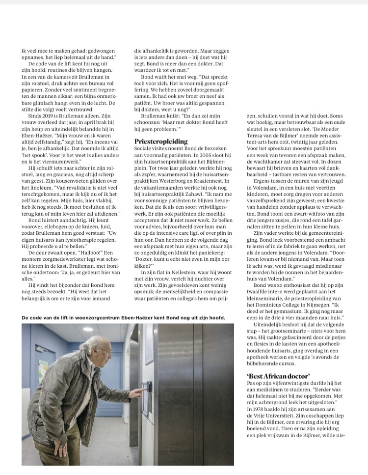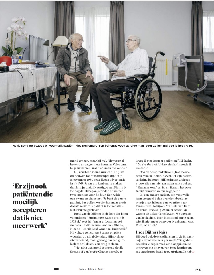 Hij was veertig jaar huisarts in de Bijlmer, een dokter die zijn patiënten kende bij naam, adres en hartslag. Nu, twee jaar na zijn afscheid, draagt huisarts Henk Bond (80) geen stethoscoop meer, maar nog altijd de zorg van toen. ‘Het ging van mond tot mond dat ik Spaans of een beetje Ghanees sprak.’ https://www.parool.nl/ps/henk-bon-was-40-jaar-huisarts-in-de-bijlmer-you-re-the-best-african-doctor-hoorde-ik-weleens~b6455a15/?fbclid=IwY2xjawN-1mVleHRuA2FlbQIxMABicmlkETBnbHNabHlNWUNLYm9WU1NVc3J0YwZhcHBfaWQQMjIyMDM5MTc4ODIwMDg5MgABHt7ekehIlcvQGP7GTimc4xWHOWFazNz8nszmor024Xh3VyMAn6MJukeLSgso_aem_Nz6-XK0Jjb7aAJot3UoqCQ