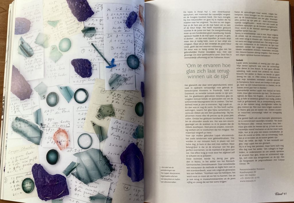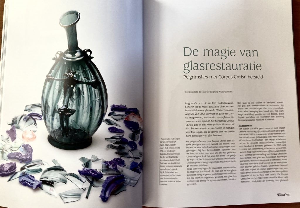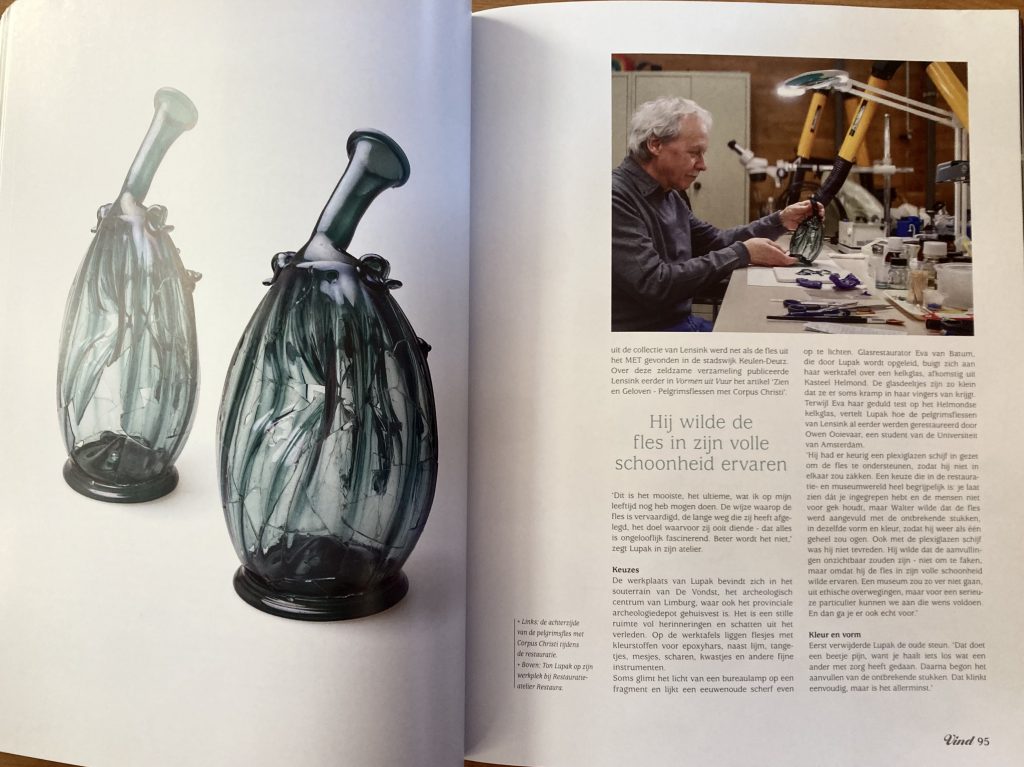 Pelgrimsflessen uit de late middeleeuwen behoren tot de meest zeldzame objecten van laatmiddeleeuws glaswerk, Walter Lensink, uitgever van VIND, verwierf in 2015 een aantal fragmenten, waaronder exemplaren die nauw verwant zijn aan het beroemde Corpus Christi-glas in het Metropolitan Museum of Art. De restauratie ervan kwam in handen van Ton Lupak, die al veertig jaar het breekbare geheugen van glas bewaart.